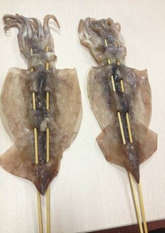 2、斷筋:大魷魚的兩邊需要剪開,每邊三刀左右,魷魚完全退冰狀態再進行一下步驟操作;