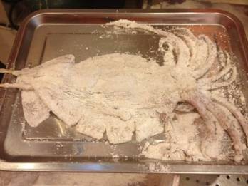 4、裹粉:在上漿后的大魷魚兩面均勻壓上香酥雞排粉,放置回潮5分鐘;